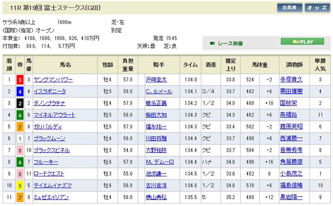 名前のダサさでは現役屈指のヤングマンパワーが、戸崎騎手とのコンビで3戦3勝目!重賞連勝で本番に堂々名乗りを挙げます。2着にさすがのイスラボニータ。しかし期待のロードクエストが出遅れてまさかの惨敗・・・本番で巻き返せるでしょうかね?
