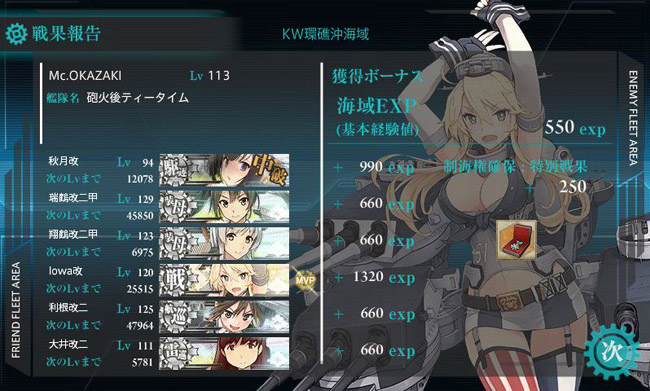 勿論道中撤退もありますが、ルート逸れが無い上に総じて全力の殴り合い展開なので、攻略していてストレスが無く爽快な海域で、自分としては非常にお気に入りとなっています。戦果値も5-5よりも高いので、必ず毎月攻略して行きたいですね。