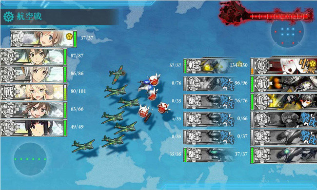 そして6-5ボス戦・・・艦これ初となる、敵の連合艦隊編成!・・・ですが、何しろ基地航空隊の存在が大きい!基地航空隊の4回に渡る攻撃と、艦隊の艦載機による開幕攻撃で敵の半数以上を無力化する事も可能なので、決して無理ゲーではないです。まぁこれと言うのも、これまでコツコツと基地航空隊を育成して来たから言える事なのかもしれませんが。