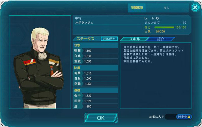 ホーランド提督率いる第11艦隊が第三次ティアマト会戦で大打撃を受け、ホーランド提督も戦死したため、その後を次いで第11艦隊の指揮官になった人物。艦隊再建のためにアムリッツァ作戦には参加しておらず、結果、参加戦力の8割を失う大敗北とは無縁でいられました。 その後は同盟軍の残された貴重な戦力となるはずだったものの、ラインハルトの仕掛けた工作によって勃発した救国軍事会議クーデターに参加。ドーリア星域の会戦でクーデター鎮圧のために出撃したヤン艦隊と戦い、全滅するまで戦い続けてヤンを手こずらせる事になります。あぁ、貴重な艦艇が。 その功績(?)が評価されてか能力値はそこそこ高め。でもまぁ、あまり積極的に使いたい人物ではありませんけどね。