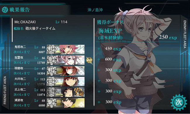 しかし上手く北ルートに乗って鬼門の夜戦マスを梯形陣で乗り切り、厳しい索敵値もクリアしてボスマスに突入し、夜戦で何とか仕留める事に成功しました(一度だけ南ルートに入って行き止まりマスに行っちゃいましたが)。何にせよ、2戦でクリア出来たのはラッキーでした。