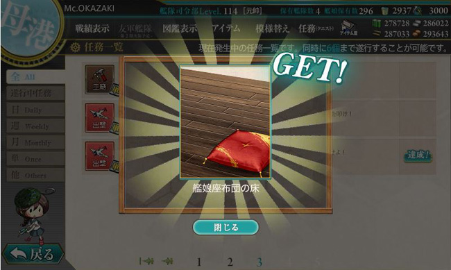 アプデと同時に鬼怒改二関連を中心にした6つの新任務が実装されたのですが、その中の1つ「第十六戦隊(第三次)出撃せよ!」で2-4ボスにA勝利以上すると、伊良湖の他にこのシークレット家具の「艦娘座布団の床」がゲット出来ます。難しい任務ではないので、チャレンジしてみると良いかもしれません。
