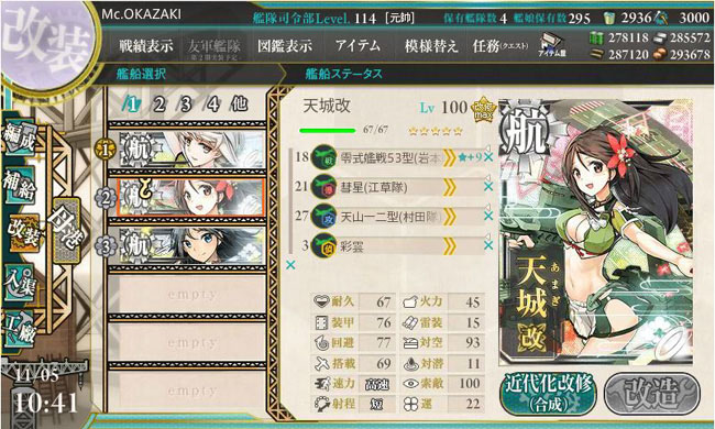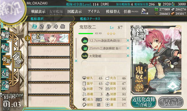 あと、先週金曜日のアプデで遂に鬼怒の改二が実装されました。必要改装レベルは75でしたが、ウチの鬼怒はLv.87だったので無問題。あ、久しぶりに改装設計図を使う改装でした。