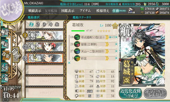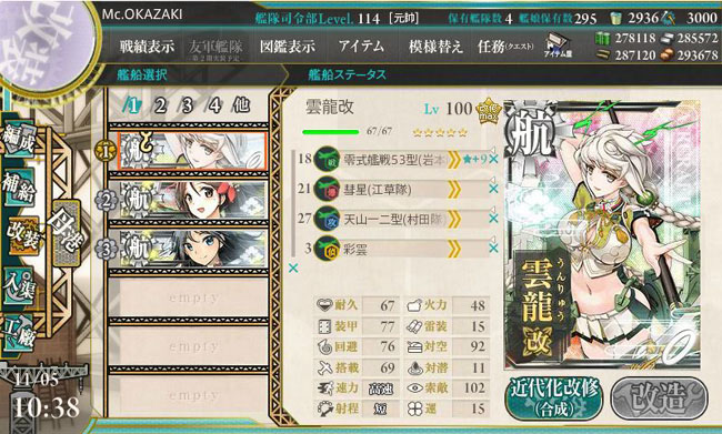 イベント海域で正規空母を出すような場面では装甲空母の瑞鶴・翔鶴・大鳳を使ってしまいますし、支援艦隊では火力の高い赤城・加賀・蒼龍・飛龍がメインとなるのでなかなか出番がない雲龍型。今後も通常海域での活躍がメインになると思います。