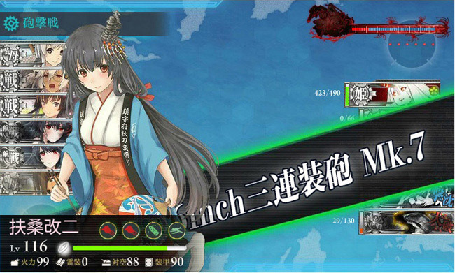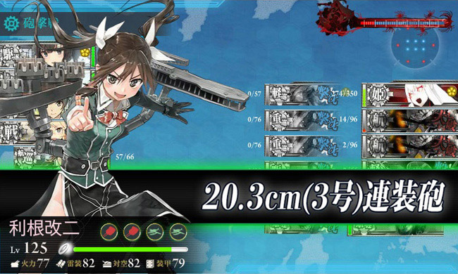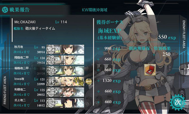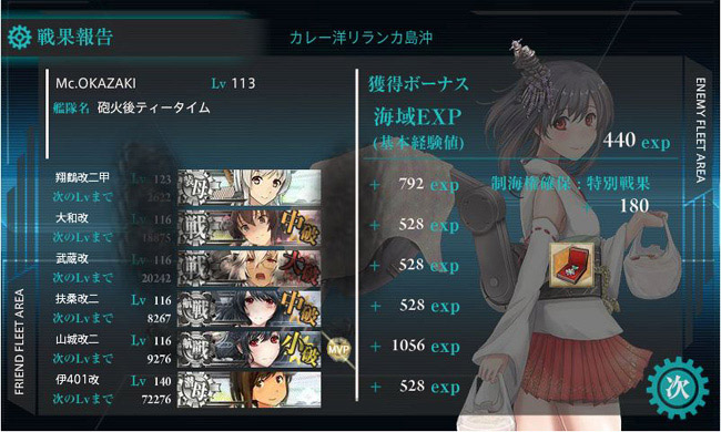 それと何気にこの海域では旗艦を務める事が多い秋月型三姉妹が成長著しいですね。3隻とも現在Lv.95で、夕立や綾波のLv.94を抜いて、駆逐艦ではトップとなっています。