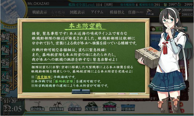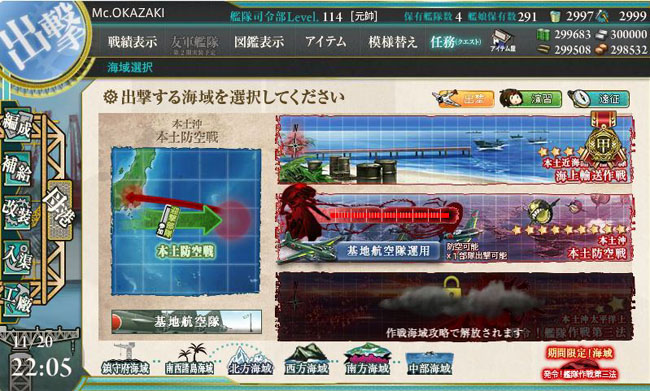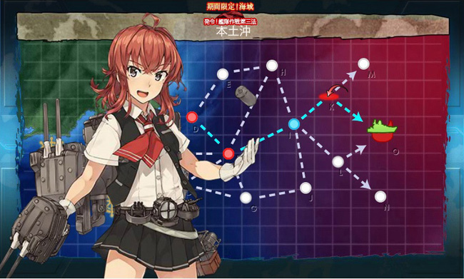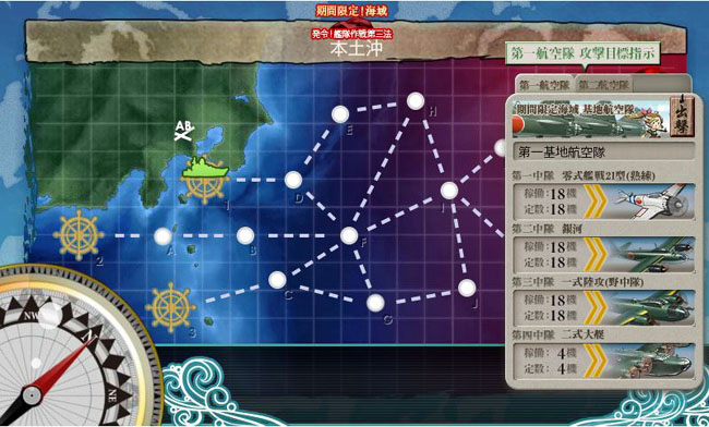 さて、遂に深海棲艦からの日本本土空襲を防ぐ本土防空戦を主題にしたMAPが登場です。本土防空という事でここでは基地航空隊も使用可能となります(2部隊のみですが)。