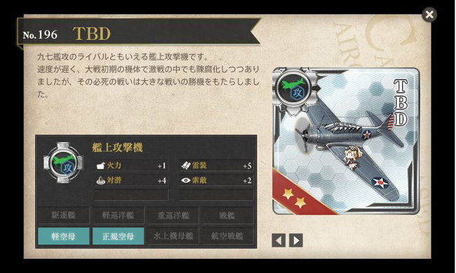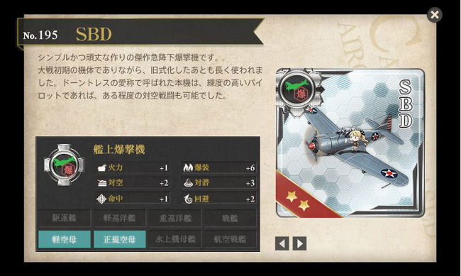 今回初登場となる新装備。まずはSBD。ドーントレスという愛称の方が圧倒的に有名な、米海軍の艦上急降下爆撃機です。