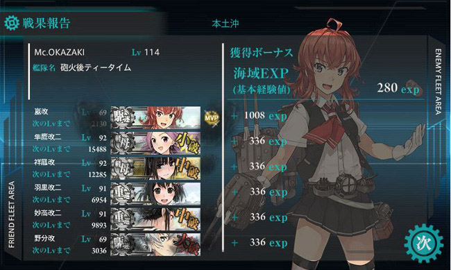 攻略時の編成・・・つーかこの海域はこの6隻のみで突破しました。戦艦も正規空母もいない、しかもケッコン艦なしの編成でしたが、まずまず順調に攻略出来たと言えますかね。