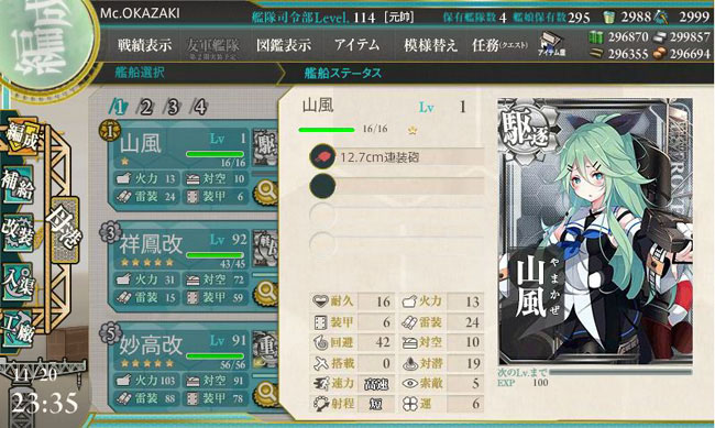 ちなみに山風のステータス・・・普通の白露型駆逐艦ですが、普通じゃないのが滅茶苦茶低い運の数値。これは、太平洋戦争の初期に日本近海で米潜水艦に沈められ、生存者ゼロだった所以。近海で痕跡を残さず忽然と姿を消した山風は、しばらく沈没ではなく消息不明扱いされてたんですよね。
