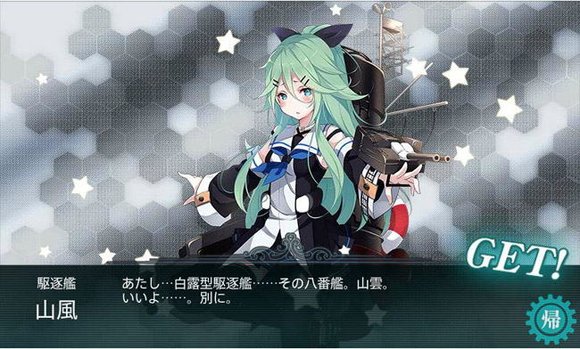 そんなボス戦4回目・・・うぉっ!!!攻略中にひょっこり出て来ましたよ!今イベで2隻いるドロップ艦の1隻、駆逐艦山風が!!・・・って、あれ??君の名は山風だよね?山雲は喋りがスローモーションなほっちゃん艦だよね??(このバグ、すぐ修正された模様)