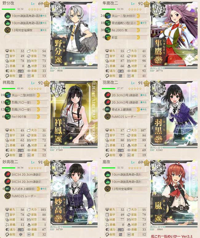 今回はその追撃戦に参加した艦艇を一定数入れる事によって、最短ルートでの攻略が可能になります。そのため、その史実艦の中から軽空母祥鳳・重巡妙高・重巡羽黒・駆逐艦野分・駆逐艦嵐をチョイス。残り1隻は最短ルート固定のために主力艦を投入出来ない都合上、軽空母ながら正規空母並の艦載機数を持つ隼鷹を投入しています。