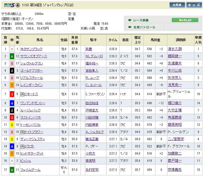 今年の1番人気はキタサンブラック・・・またも1枠1番に入る幸運。しかも今回のジャパンカップは第36回で北島「サブロー」とサインもバッチリ。おまけに馬体重も536kgにまとめて来ましたw でも、京都大賞典からの直行組ってあまり良績を残していないんですよね・・・。