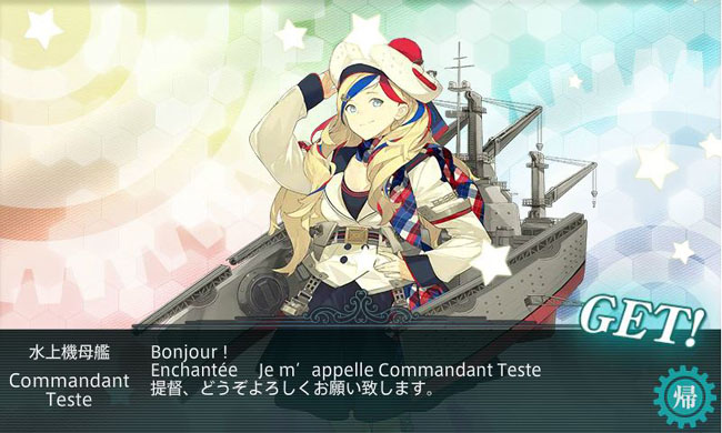 そして今イベ初の報酬艦娘は、フランスの水上機母艦コマンダン・テスト!いやー、本当にマイナーな艦を実装したもんです。普通、フランス艦と言ったらリシュリュー級戦艦とかじゃないの?