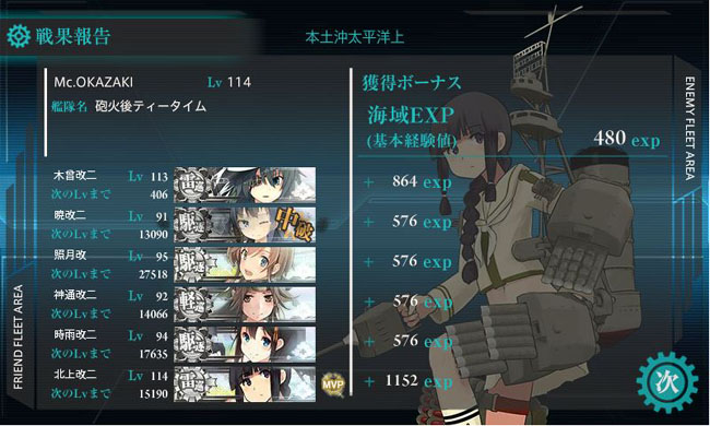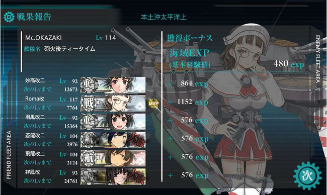終始旗艦として艦隊を率いた妙高さんが凛々しいです。しかし妙高と羽黒を固定艦としてここで連戦させた結果、那智・足柄と少し経験値に差が付いてしまいました。那智と足柄は演習で鍛えないと・・・(同型艦はレベルが揃ってないと落ち着かないんで)