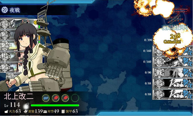 ラスダン、一発クリア!決めてくれたのは勿論この人、北 上 様 !!運改修の甲斐があった・・・と言いたい所なのですが、装備を見ても分かる通り、実は全然魚雷カットインが出ないので途中から連撃装備に切り替えちゃいました。