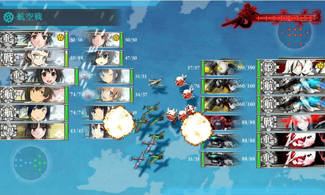 作戦としては、E-2で撃破した他にまだ敵の本隊「シャングリラ」が存在するという設定で、これを叩くのが主旨。大規模な敵の艦隊との殴り合いマップですが、ルート固定艦を一定数以上入れる事によって道中を消費の少ない最短ルートで進み、敵本隊と全力で戦えます。ルート固定艦を上手く組み込んだ編成と、しっかり制空権を獲れる計算が攻略の鍵となります。