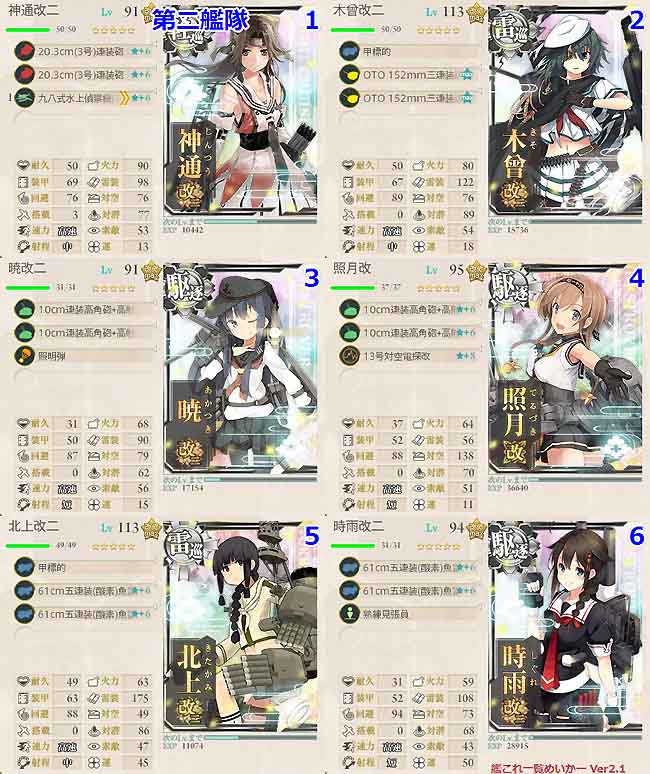 第2艦隊のルート固定艦は神通と木曾。これまた最強クラスの軽巡とケッコン済みの雷巡なので問題はありません。あとは対空カットイン要員として照月をここに投入。対空戦闘補佐と夜戦時の照明弾要員、さらに道中撤退が生じた時の随伴艦役として暁を組み入れ、ボススナイプ用にイベント直前に運改修を行った決戦兵器・北上をここで投入。更にWカットイン要員として時雨を配し、夜戦でボス絶対殺すマン編成としています。