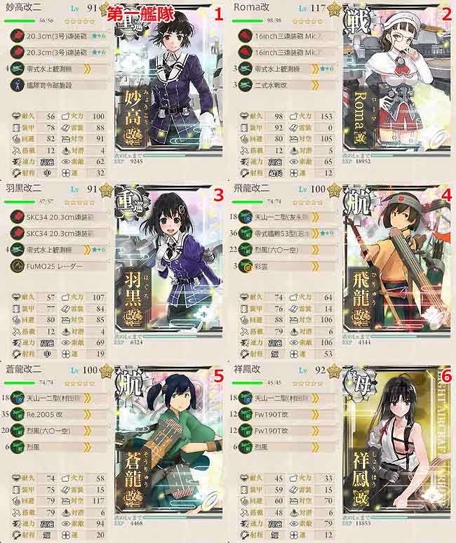 まずは第1艦隊。妙高・羽黒・飛龍・蒼龍・祥鳳の5隻がルート固定艦となります。この内、祥鳳以外は普通に高性能の重巡と正規空母なので前線投入は問題なし。祥鳳もニ航戦のフォローがあれば十分戦えるレベルにまで育てています。ただ、空母3隻では少し制空値に不安があるので、水上戦闘機が搭載出来るイタリアの高速戦艦ローマをここに組み込みました。これでボスマスでも航空優勢を狙えます。