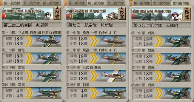 前段作戦クリア条件の1つに、基地の防空で複数回「制空権確保・被害なし」を出す事もあるので、まずは基地航空隊は防空に専念。ズラリ揃えた局地戦闘機の出番です。防空任務に成功した後は、艦隊の支援のためにAマスに攻撃隊を向かわせます。