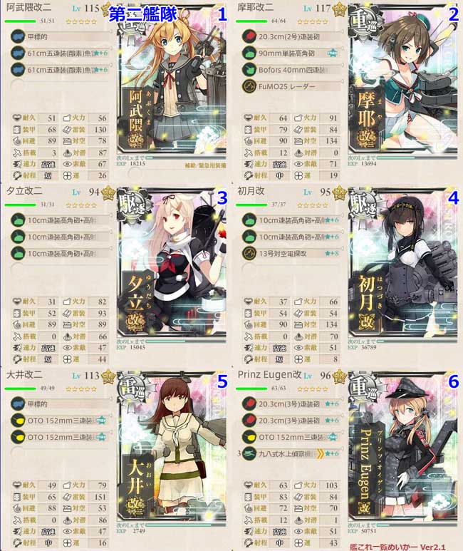 第2艦隊は主に防空任務と先制雷撃。摩耶+初月のW対空カットインメンバーで発動率を上げ、阿武隈と大井の開幕雷撃でともかく敵の数を減らします。夕立も秋月砲で対空兼連撃装備です。オイゲンに副砲を搭載したのは、元々低めの火力を補うためと、命中率の向上のため。まぁ前段作戦では特効は出ないんですけどね。