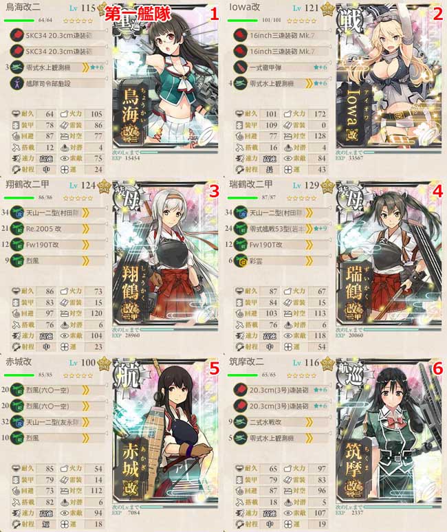 第1艦隊はこんな感じ。S勝利を獲るためには戦艦を入れて攻撃を二巡させる必要があるので、ここは温存して来た最強高速戦艦のアイオワを投入。更に瑞鶴・翔鶴・赤城で制空+空撃を担い、航巡の筑摩は二式水戦を搭載して制空支援。旗艦はやはり火力が頼りになる鳥海ですね。