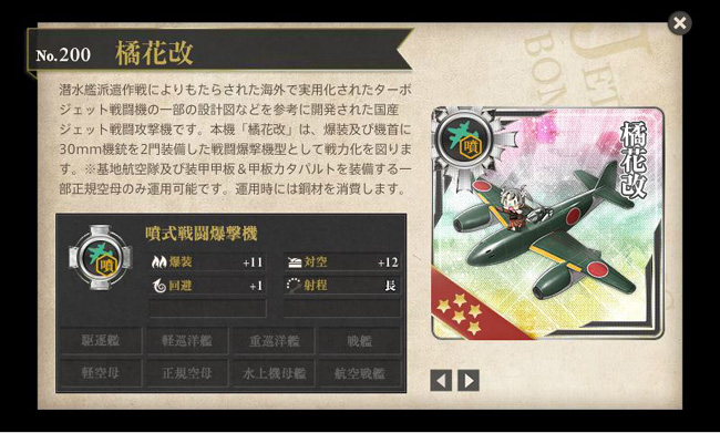 これまでのカテゴリとは別の「噴式戦闘機」となるこの機体。航続距離は短いものの、対空12・爆走11と高い数値を誇る他、噴式機専用の攻撃ターンがあり、実質航空攻撃を2回出来るメリットがあります。