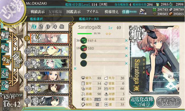 続いて正規空母サラトガもLv.40で第一次改装が可能です。ちなみに新規入手駆逐艦の山風はLv.45、朝雲はLv.50が必要改装レベル・・・駆逐艦のくせに正規空母よりも高いレベルを要求して来るなんて。