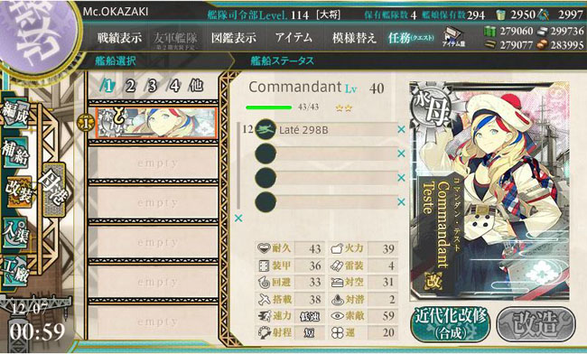 まずは水上機母艦コマンダン・テストがLv.40で第一次改装を終えています。コマちゃんは秋イベ攻略後、E-5の潜水艦マスで駆逐艦部隊を率いてレベリングを行っていたので、比較的早くレベルアップしています。