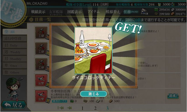 あと、水上機母艦を旗艦にして駆逐艦3隻+その他2隻で1-3と1-4のボスにS勝利する任務では、補強増設の他にシークレット家具のライスコロッケディナーが入手出来ます。難しい任務じゃないし、ここでしか手に入れられない家具なので是非押さえておきたいところです。