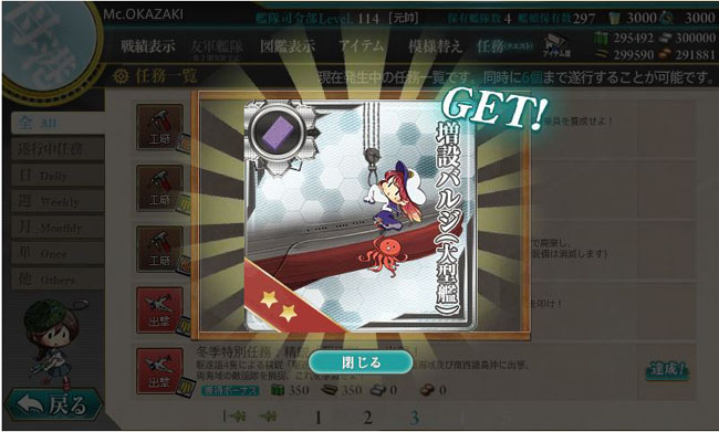 新任務の1つ、駆逐艦4隻で1-1と1-2のボスにS勝利をする任務をクリアすると、家具職人の他に25_三連装機銃★3か、増設バルジ(大型)が貰えます。補強増設にバルジが装備出来るようになったり、改修も出来るようになったりとテコ入れが入っているので、ここはバルジを貰っておきました。