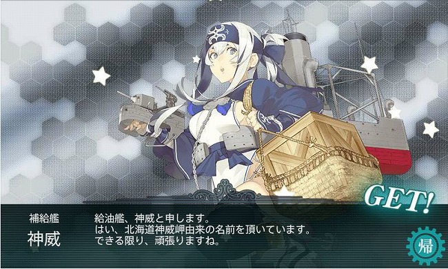 ・・・と気合いを入れていたものの、6回目の掘りでひょっこり出て来ましたよ神威さん!(しかもA勝利で) 艦娘では初めてのアイヌっ娘ですな。うたわれるものです(違