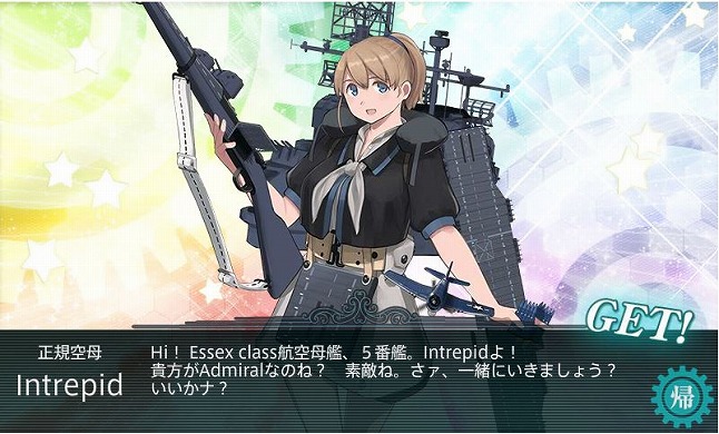 そして海域突破報酬にして、今イベント7隻目の新艦娘となるのが正規空母イントレピッド。太平洋戦争後半、米軍の総反撃の尖兵となったエセックス級正規空母の1隻で、戦後も改装を重ねてベトナム戦争以降まで息の長い活躍をした名空母です。