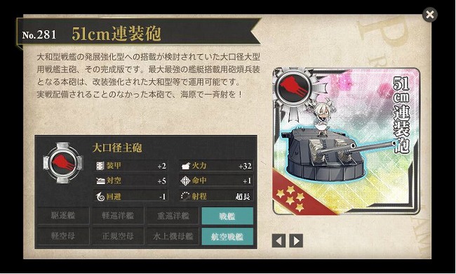 命中面ではアイオワ砲やアイオワ砲改に及びませんが、何と言っても火力+32は圧巻!やはり武蔵に搭載しておきますかね。