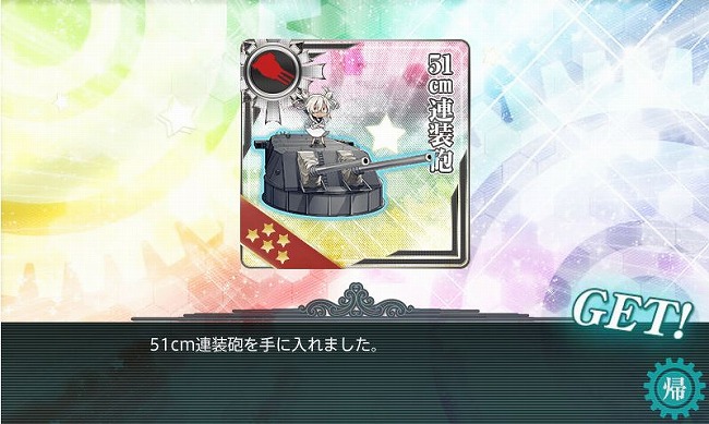 E-7甲作戦の海域突破報酬は、勲章x2、改修資材x10、51cm連装砲、紫電改(三四三空) 戦闘301。最強の艦砲と最強の局地戦闘機、ゲットだぜ!