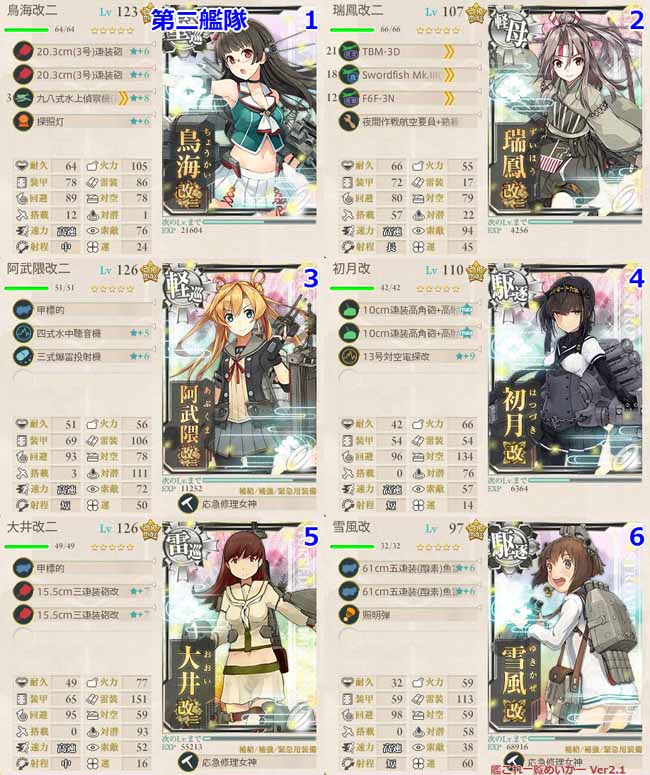 第2艦隊は鳥海をメイン火力とし、初月で対空CI、阿武隈は先制雷撃+Dマスの潜水艦対策。切り札は連撃装備の大井と夜襲装備の瑞鳳、魚雷カットイン装備の雪風です。
