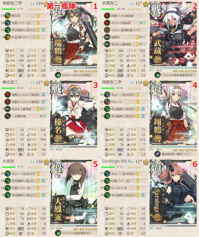 基幹を成すのは瑞鶴・翔鶴・大鳳・サラトガの装甲空母4隻。我が艦隊の最強空母四天王です。エンガノ岬沖海戦がモチーフなので、旗艦はやはり瑞鶴を据えたいところ。特効を持つ翔鶴は戦爆連合によるカットインが出せるような編成に。特効が無い大鳳とサラトガは1スロ目に強力な艦攻を置く以外は制空重視です。
