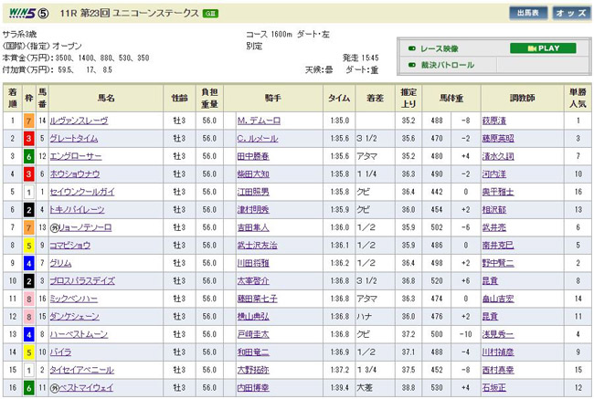 また今週もデムルメ!特にルメールのグレートタイムは絶望的な位置から見事に追い込んでの2着で圧巻でした。しかし3着は7番人気のエングローサーでドボン。テン乗りの勝春とか買い難いですよ・・・。